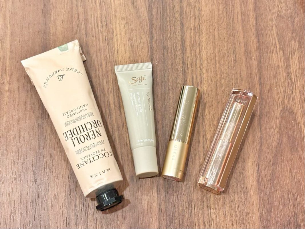 ▲左から、ロクシタンのハンドクリーム、Sajeのリップ、オペラのリップ、ランコムのリップ。