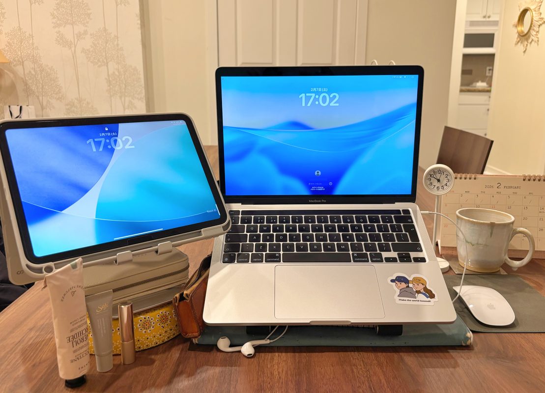 MacBookもiPadも、やっぱり高さが重要ですね。もちろん、Macbookにもスタンドを使用しています。